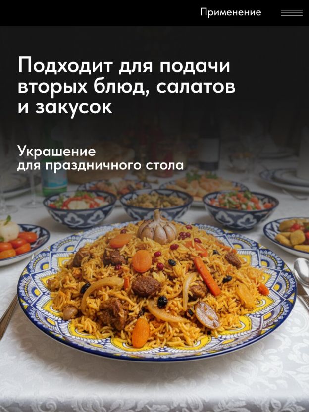 Да, благодаря оригинальному восточному орнаменту и насыщенному цвету, тарелка отлично смотрится в сервировке для гостей, тематических ужинов и подарочных наборов.