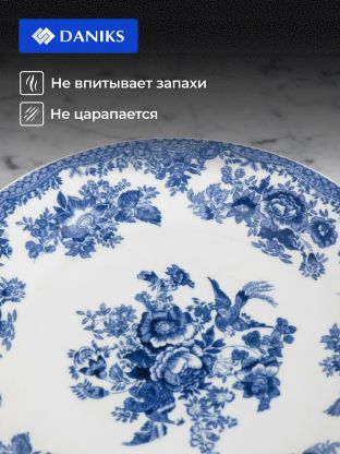 Керамика лучше сохраняет тепло пищи, не впитывает запахи и устойчива к царапинам. Гжельский рисунок делает сервировку праздничной, а бренд Daniks гарантирует надежность.