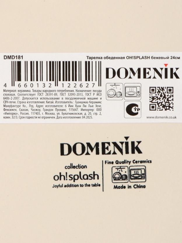 Тарелка обеденная Domenik OH!SPLASH 24 см — стильное решение для сервировки: керамика, универсальный размер, подходит для СВЧ и посудомоечной машины.