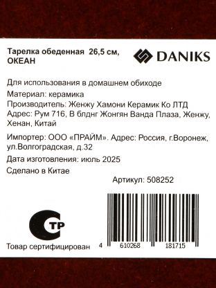 Покупатели часто спрашивают: «Как выбрать размер тарелки?» — оптимальный диаметр 26,5 см достаточен для подачи основных блюд и закусок. В отличие от аналогов из стекла или пластика, керамика Daniks устойчива к царапинам и не впитывает запахи. Тарелка подходит для использования в микроволновой печи и мытья в посудомоечной машине, что экономит время и силы при уходе.