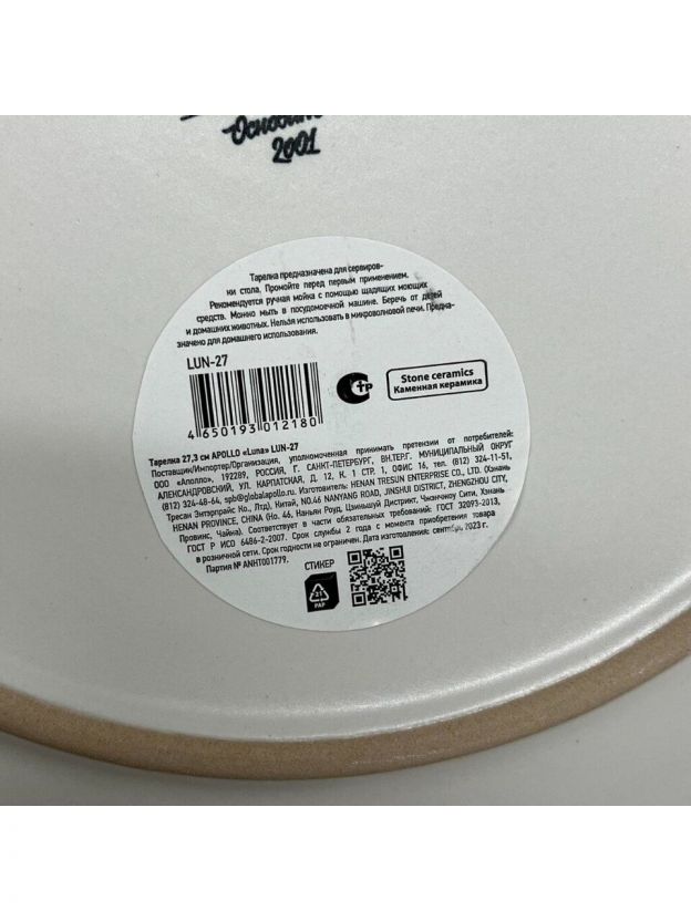 Тарелка обеденная, керамика, 27.3 см, круглая, Luna, Apollo, LUN-27, белая