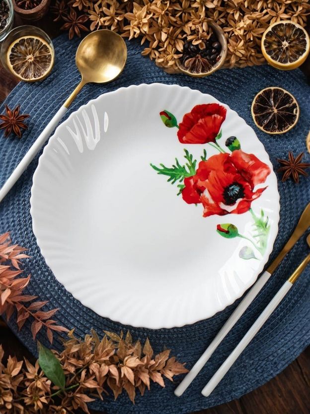 Часто спрашивают: чем отличается стеклокерамика от обычной керамики? Стеклокерамика легче, прочнее и не боится перепадов температур, поэтому тарелку можно безопасно ставить в микроволновку и мыть в посудомоечной машине. Если вы ищете, какую тарелку выбрать для сервировки, обратите внимание на коллекцию с цветочным рисунком — она украсит любой интерьер. Благодаря качественной печати рисунок не тускнеет со временем, а белый фон подчеркивает яркость мака.
