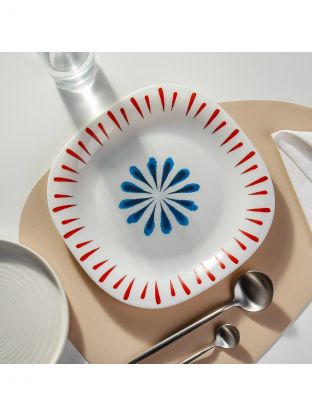 Тарелка выполнена из стеклокерамики — это прочный, долговечный материал, устойчивый к царапинам и сколам. Квадратная форма и белый цвет с узором делают её универсальной для сервировки.