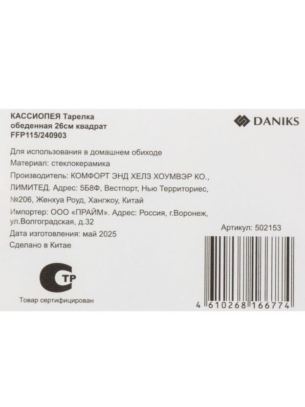 Тарелка стеклокерамика 26 см Кассиопея от Daniks — это современное решение для сервировки, где важны не только внешний вид, но и функциональность. Квадратная форма и белый цвет с декоративным рисунком гармонично впишутся в любой интерьер. Благодаря прочности стеклокерамики, изделие устойчиво к сколам и царапинам, что особенно важно для ежедневного использования. Часто спрашивают: «Как выбрать тарелку для дома или дачи?» — обратите внимание на материал и размер: стеклокерамика легче и долговечнее, а 26 см — универсальный диаметр для обеда или ужина.