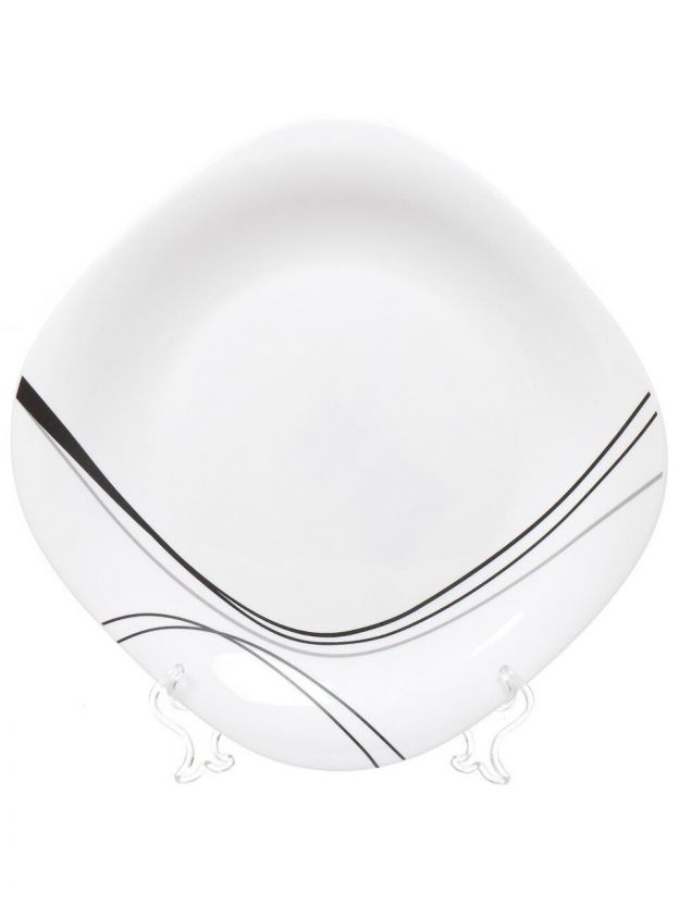 Диаметр — 26 см, материал — стеклокерамика, цвет — белый с абстрактным узором, форма — квадратная.