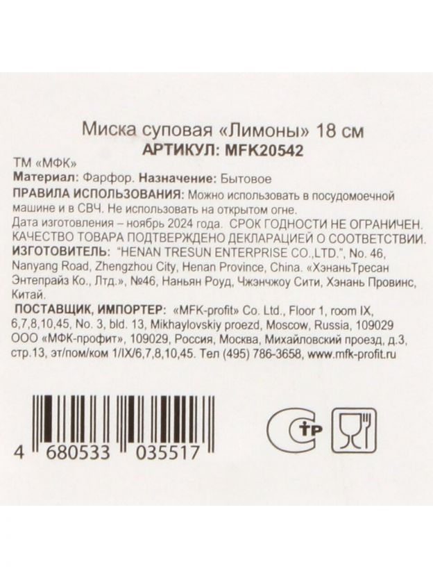 Тарелка суповая фарфоровая 18 см «Лимоны» МФК — яркий акцент на вашем столе: прочный фарфор, подходит для СВЧ и посудомойки, идеальный выбор для дома и дачи.