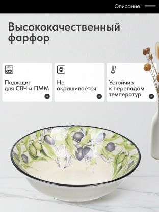 Тарелка суповая фарфоровая 18 см «Оливки» МФК — стильная посуда для дома и дачи, устойчива к микроволновке и посудомойке, выгодно купить для сервировки и подарка. Почему выбирают: Дизайн с оливковым орнаментом — эстетика средиземноморья для вашей кухни, уникальное оформление стола Фарфор высокого класса, диаметр 18 см — оптимальный размер для супа, каши и салатов, долговечность без сколов Универсальность: подходит для дома, дачи, праздничного ужина, практичный подарок Фарфоровая суповая тарелка МФК диаметром 18 см из коллекции «Оливки» — это гармония красоты и практичности. Благодаря прочному фарфору изделие выдерживает интенсивное использование, не теряет блеска и легко моется в посудомоечной машине. Круглая форма и растительный орнамент делают тарелку универсальной: она подходит для подачи супов, рагу, пасты и даже десертов. Если вы ищете, какую суповую тарелку выбрать для сервировки или что лучше для ежедневного использования, обратите внимание на этот вариант — он сочетает эстетичность и функциональность. В отличие от керамических или стеклянных аналогов, фарфор не впитывает запахи и не царапается при частом мытье. Тарелка пригодна для разогрева в микроволновой печи, что удобно для быстрого обеда или ужина. Часто спрашивают, как использовать фарфоровую суповую тарелку на даче — она устойчива к перепадам температуры и легко впишется в любой интерьер. Подходит ли для подарка? Безусловно: изысканный дизайн и универсальный размер делают эту тарелку желанным презентом для близких. Оформите заказ на фарфоровую суповую тарелку «Оливки» прямо сейчас — получите быструю доставку, гарантию качества и стильную посуду для любой кухни. Частые вопросы: Можно ли мыть эту тарелку в посудомоечной машине? Да, фарфоровая тарелка МФК «Оливки» подходит для мытья в посудомоечной машине и не теряет рисунка даже при ежедневном использовании. Чем эта суповая тарелка удобнее аналогов для дачи? Фарфор устойчив к перепадам температуры, не впитывает запахи, а универсальный размер 18 см удобен для разных блюд — от супа до салата. Какой диаметр и форма у этой тарелки? Диаметр 18 см, форма круглая — оптимально для порционной подачи первых блюд, каш и закусок. Дополнительная информация: Объем тарелки:~ 550 мл.