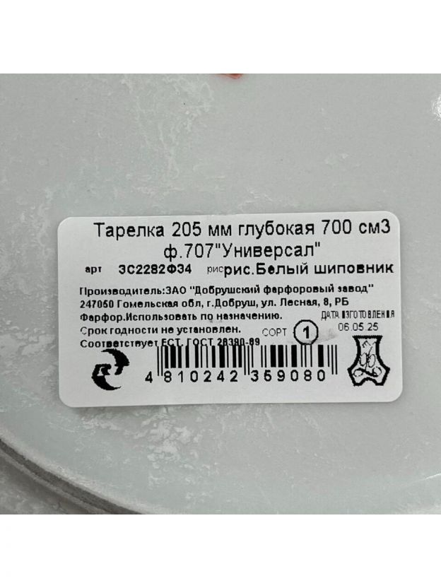 Тарелка суповая, фарфор, 20.5 см, 0.7 л, круглая, Универсал Белый шиповник, Добрушский фарфоровый завод, 3С2282Ф34