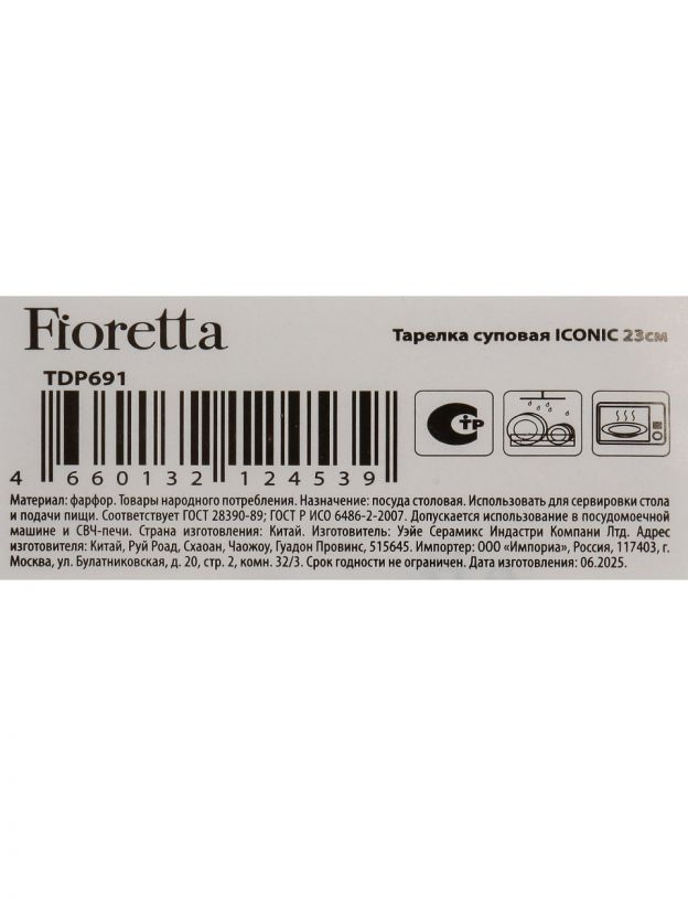 Тарелка суповая фарфоровая 23 см Fioretta Iconic TDP691: стиль, прочность и универсальность для вашего стола — выгодная цена, премиум-фарфор, подходит для посудомоечной машины и СВЧ.