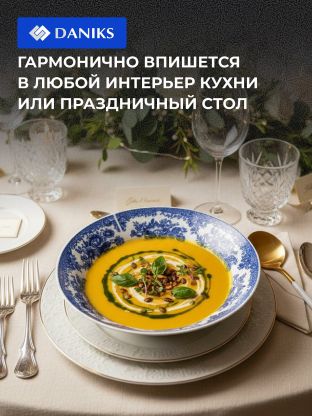 Тарелка суповая Daniks Жар-Птица 20 см — стильная керамика с гжельским узором для уютных обедов дома и на даче. Безопасна для СВЧ и посудомоечной машины.