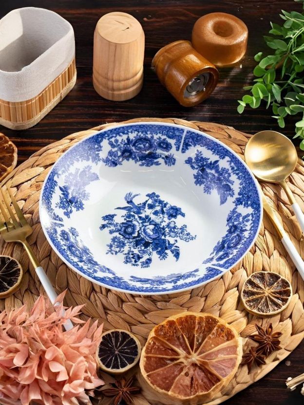 Многие спрашивают: «Чем отличается керамическая тарелка от фарфоровой или стеклянной?». Керамика лучше сохраняет тепло, не царапается приборами и надолго сохраняет яркость рисунка. Подходит ли эта тарелка для микроволновки? Да, она полностью безопасна для СВЧ-печей и не теряет своих свойств при частом использовании. Если вы ищете, какую суповую тарелку выбрать для дачи или подарка, обратите внимание на коллекцию Жар-Птица — узнаваемый синий узор и универсальная форма впишутся в любой интерьер.