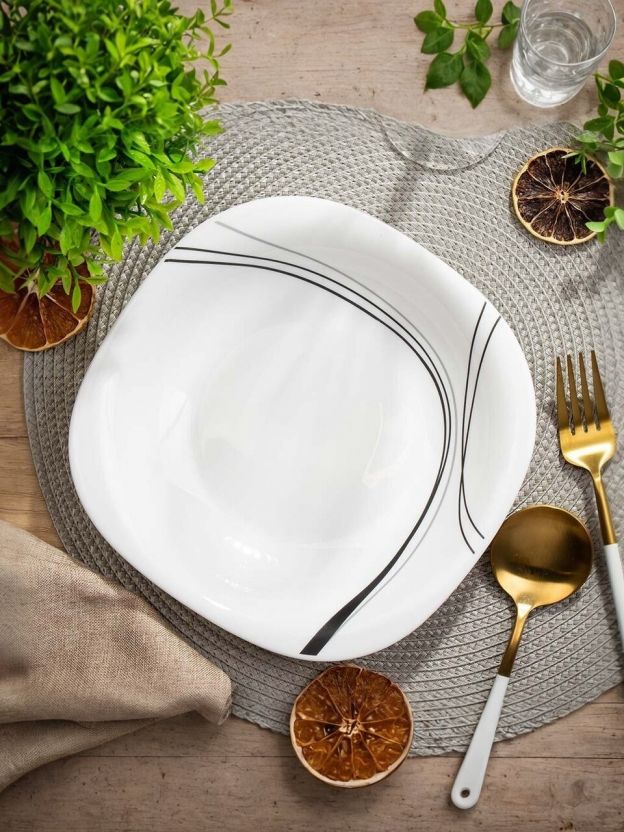 В отличие от классических круглых тарелок, квадратная форма Daniks Токио смотрится современно и выгодно выделяет сервировку. Белый цвет с абстрактным рисунком делает её подходящей как для повседневного использования, так и для праздничного стола. Если вы ищете, чем отличается стеклокерамика от фарфора, — этот материал прочнее, легче переносит перепады температуры, не боится микроволновки и сохраняет внешний вид даже при активной эксплуатации.