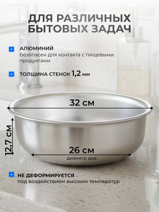 - Пищевой алюминий является безопасным материалом для контакта с пищевыми продуктами. Это значит, что таз можно использовать для приготовления пищи, не опасаясь за здоровье.
