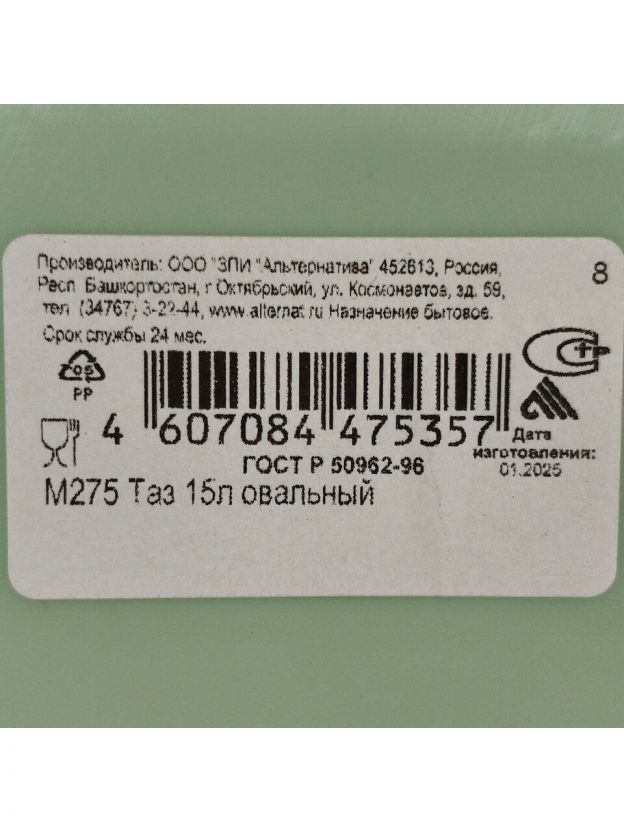 Таз пластик, 15 л, овальный, с ручкой, в ассортименте, Альтернатива, М275