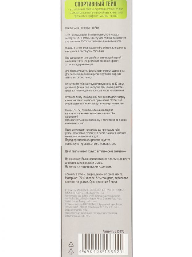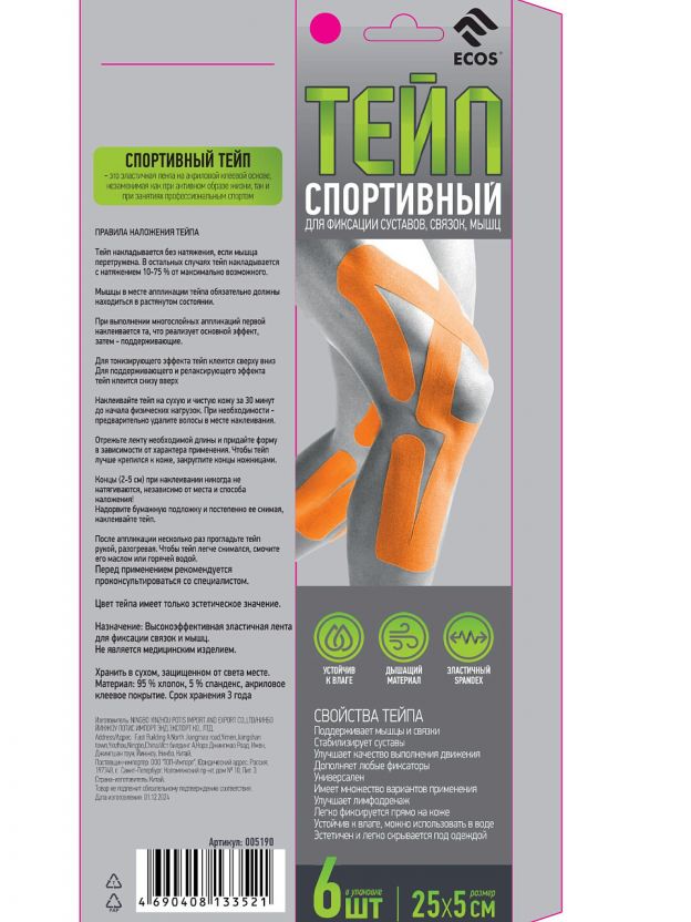 Тейп имеет длину 25 см, ширину 5 см, выполнен из 95% хлопка и 5% спандекса, что обеспечивает эластичность и комфорт.