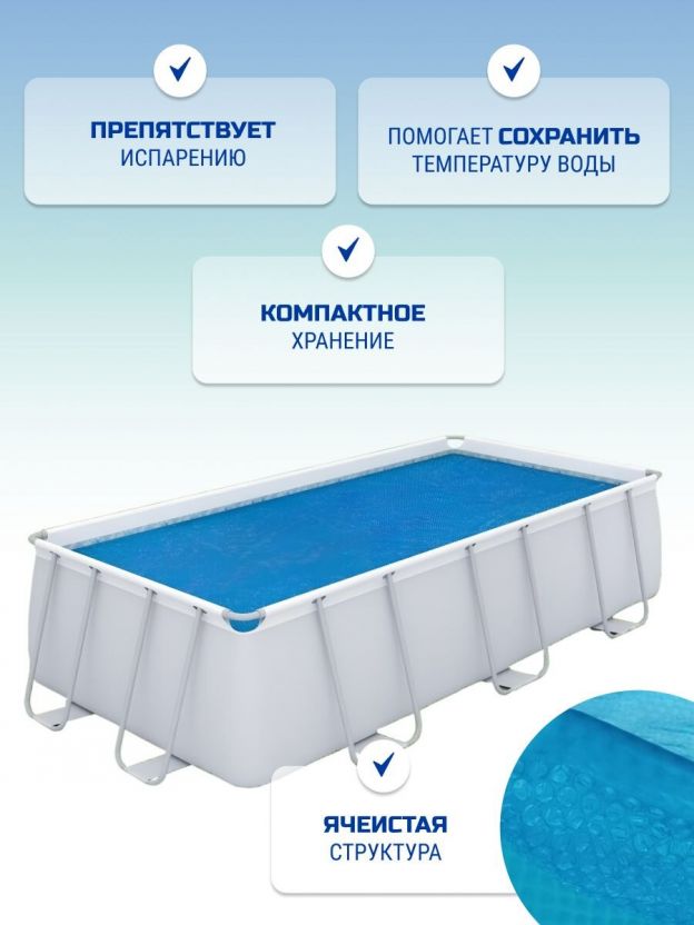 - ускоренный нагрев воды: благодаря воздушно-пузырчатой пленке, тент эффективно сохраняет тепло, что позволяет быстрее нагревать воду под воздействием солнечных лучей;