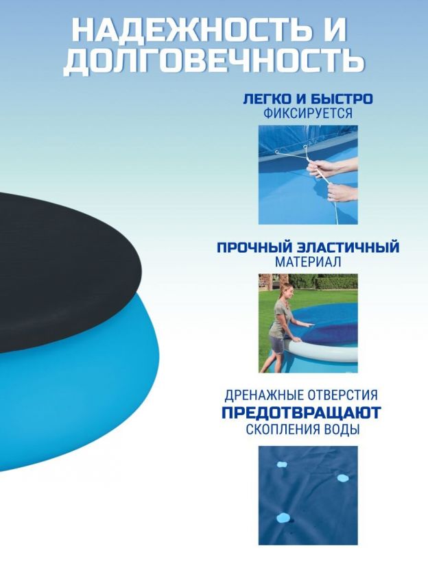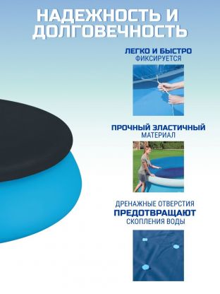Тент Bestway оснащен дренажными отверстиями, которые предотвращают скопление воды на его поверхности, обеспечивая чистоту и порядок. Специальный шнур, пропущенный по периметру тента, надежно фиксирует его, защищая бассейн от мусора и загрязнений. Это особенно актуально в ветреную или дождливую погоду.