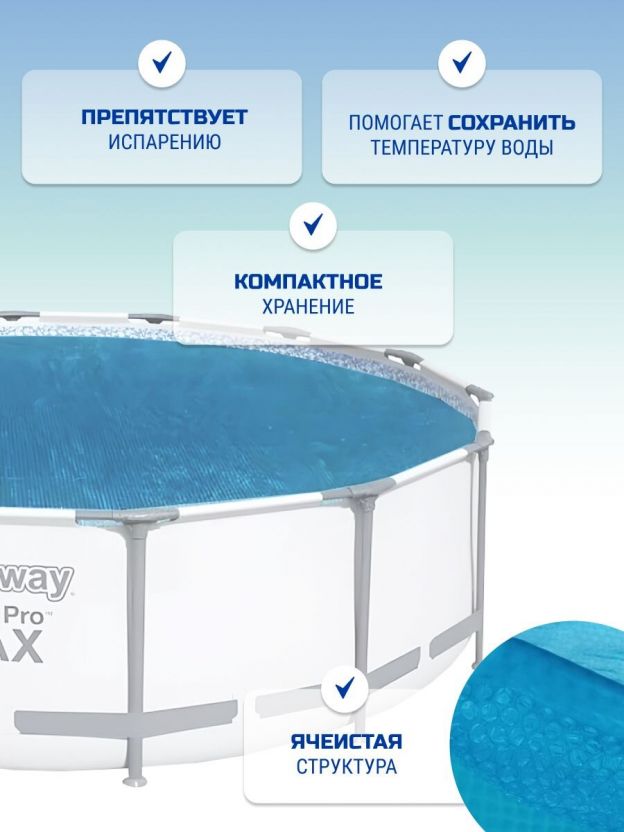 Тент Bestway 58252 подходит для всех типов бассейнов благодаря своей универсальной форме и размеру. Прозрачная пленка голубоватого оттенка с воздушными пузырьками размещается непосредственно на поверхности воды, создавая дополнительный согревающий эффект. Это позволяет значительно сократить расходы на подогрев воды, что станет весомым преимуществом для владельцев бассейнов.