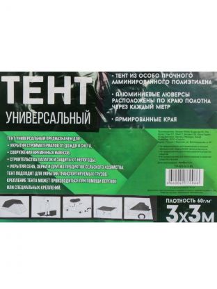 Тент универсальный 300х300 см — надежное решение для защиты от дождя, солнца и града на даче, в саду, на стройке или во время отдыха на природе. Прямоугольная форма и компактные размеры позволяют использовать его как навес, укрытие для хозяйственных нужд, туристических походов, а также для временного хранения инвентаря или строительных материалов. Благодаря плотности 60 г/м2 тент легкий, но прочный, что обеспечивает удобство транспортировки и быструю установку.