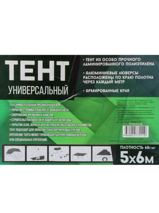 Тент универсальный, 600х500 см, 60 г/м2, люверсы через 1 м, TP-60-5-6-BL