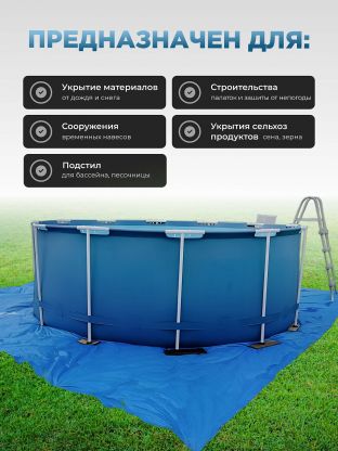 Тент универсальный 600х600 см, 60 г/м2 — надежное решение для защиты от дождя, солнца и града. Прочный прямоугольный тент из полиэтилена синего цвета станет незаменимым помощником для дачи, сада, стройки, путешествий и хозяйственных нужд. Благодаря большой площади покрытия и плотности материала 60 г/м2, изделие эффективно защищает любые поверхности и объекты от неблагоприятных погодных условий, сохраняя чистоту и сухость даже в непредсказуемую погоду.