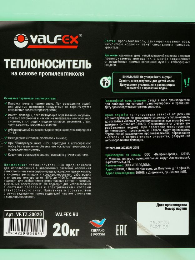 Теплоноситель Valfex ECO-30 на пропиленгликоле, 20 кг — безопасное решение для автономных систем отопления дома и дачи. Не горюч, экономит до 30% на обслуживании.