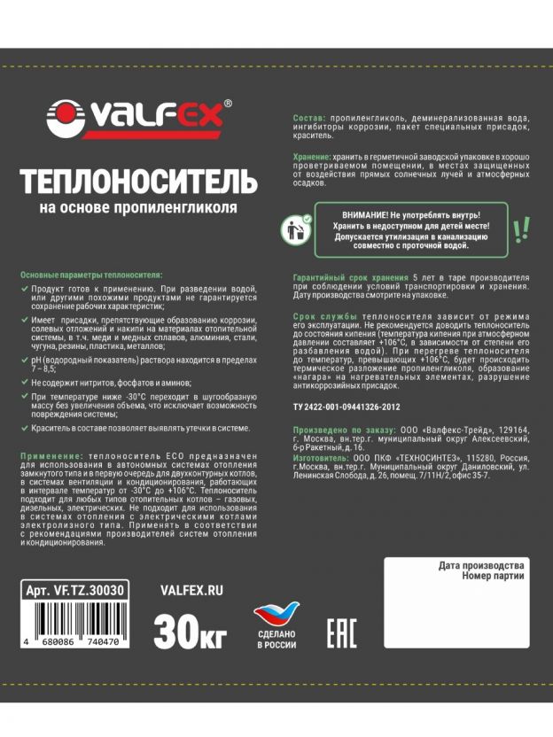 Valfex ECO-30 на пропиленгликоле — безопасный, не горючий, подходит для всех типов отопительных систем, минимизирует риск коррозии и не требует частой замены.