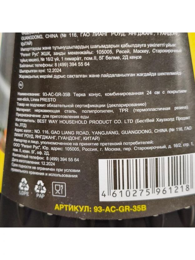 Эта терка выполнена из нержавеющей стали, что гарантирует долговечность и надежность в использовании. Конусная форма и покрытие non-stick обеспечивают удобство и легкость в уходе. Размеры 11.5х11.5х24 см делают ее компактной и удобной для хранения, а пластиковая рукоятка обеспечивает комфортное использование.