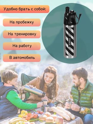 - Уникальный распылитель — охлаждение лица и рук в жару, освежение во время тренировки.