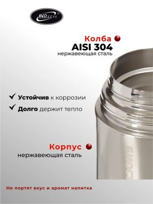 Термос сохраняет тепло до 16 часов, холод — до 19 часов. Корпус и колба выполнены из нержавеющей стали, что обеспечивает длительное поддержание температуры и дополнительную ударопрочность.