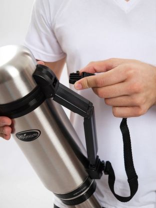 Объем термоса составляет 1.5 литра, корпус и колба изготовлены из прочной пищевой нержавеющей стали без запаха и вредных примесей. Высота — 30 см, цвет — серебристый.