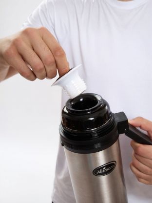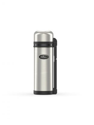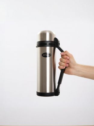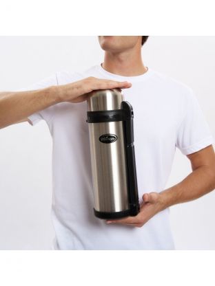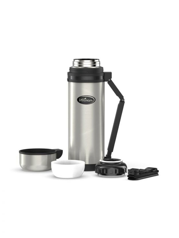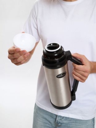 Объем — 1.8 литра, высота — 34.3 см, корпус и колба полностью из нержавеющей стали, есть ручка и ремешок для переноски.