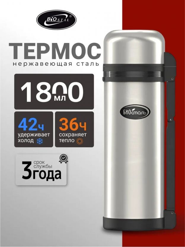 Термос для еды Biostal 1.8 л — сохраняет тепло до 36 часов, ударопрочный корпус из нержавеющей стали, универсальная горловина для любых блюд.