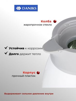 Термос-кувшин Daniks сохраняет тепло и холод до 24 часов благодаря стеклянной колбе и узкому горлышку.