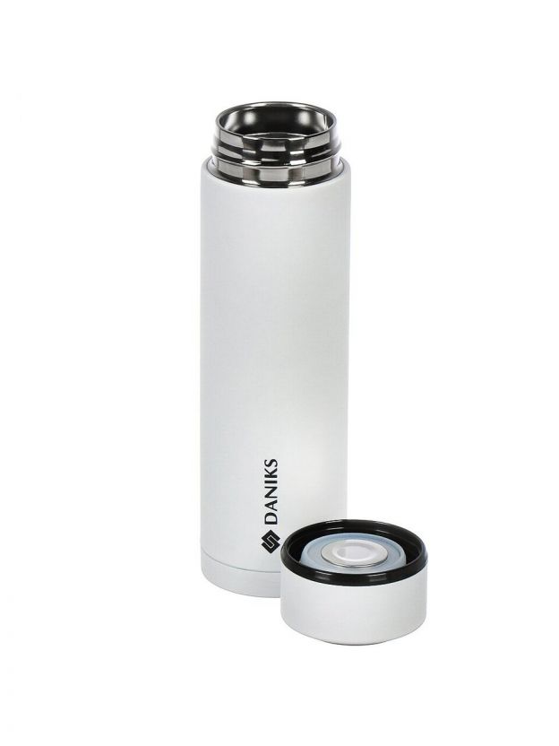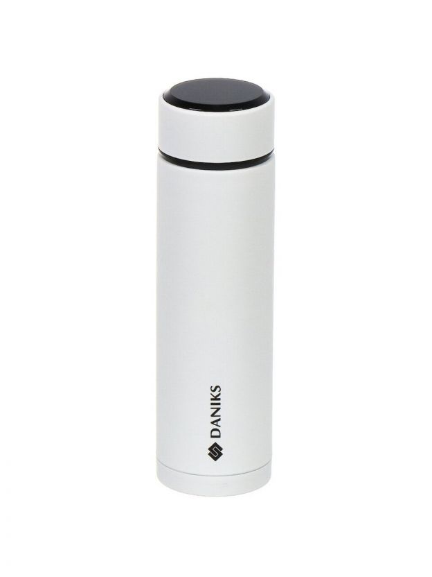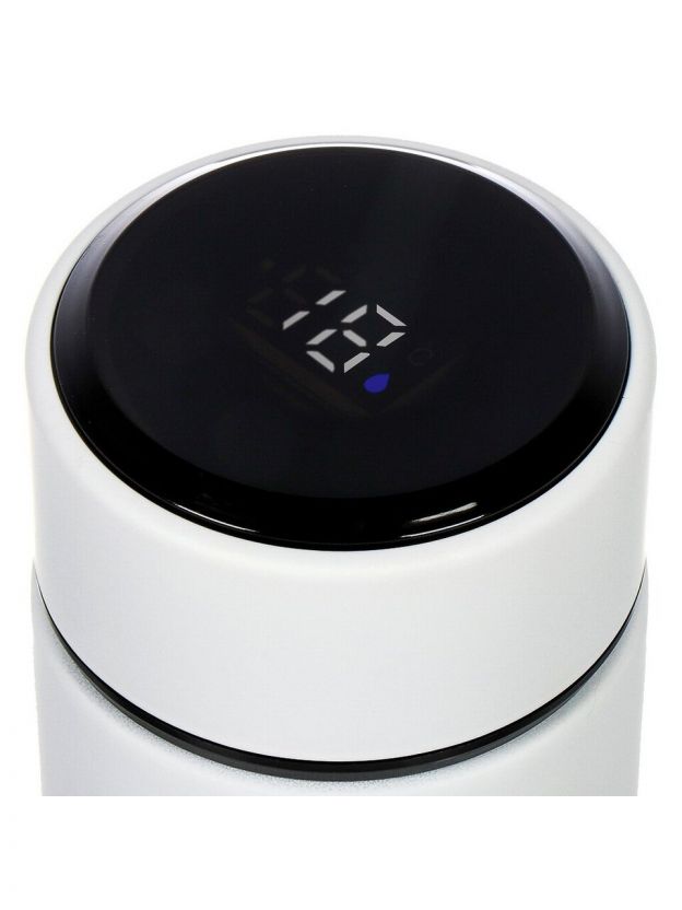 Термос Daniks 0.48 л с датчиком температуры: держит тепло и холод до 24 часов, корпус — нержавеющая сталь, стильный белый дизайн для города и автомобиля.