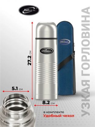 Термос Biostal 0.75 л из нержавеющей стали: держит тепло до 28 часов, ударопрочный, с чехлом — идеальный выбор для города, дачи и походов.