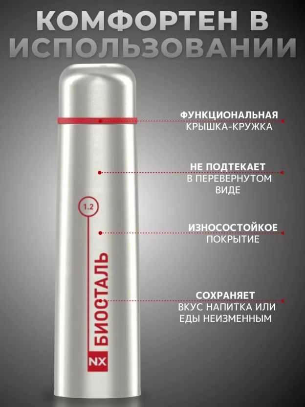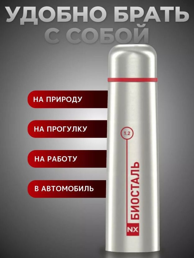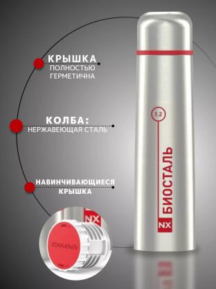 • Двойная стальная колба Biostal: надёжная термоизоляция, сохраняет температуру до 24 часов.