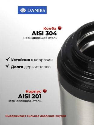 Термос Daniks SL-180GH сохраняет температуру напитков до 24 часов благодаря двойным стенкам из нержавеющей стали и герметичной крышке с клапаном.
