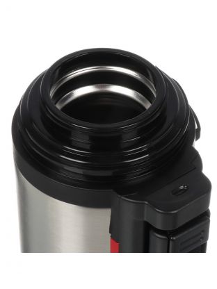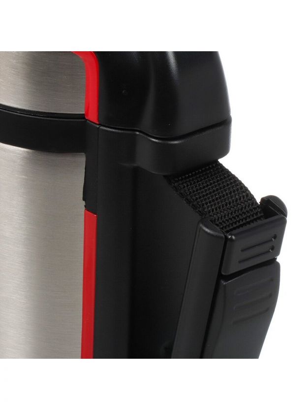 Высота — 33.5 см, объем — 1.8 литра, материал корпуса и колбы — нержавеющая сталь. Благодаря ручке удобно брать с собой в дорогу.