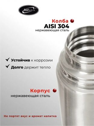 Как использовать термос Biostal? Просто налейте напиток через узкую горловину, плотно закрутите крышку и возьмите с собой — термос легко помещается в рюкзак или автомобильный подстаканник. Серебристый цвет и лаконичный рисунок делают его отличным подарком для мужчин и женщин.