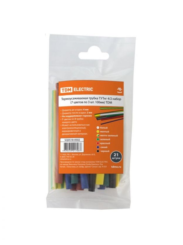 Термоусадочная трубка 4/2 мм, 21 шт, набор, 7 цветов по 3 шт, 100 мм, TDM Electric, SQ0518-0502