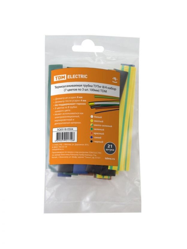 Термоусадочная трубка 8/4 мм, 21 шт, набор, 7 цветов по 3 шт, 100 мм, TDM Electric, SQ0518-0504