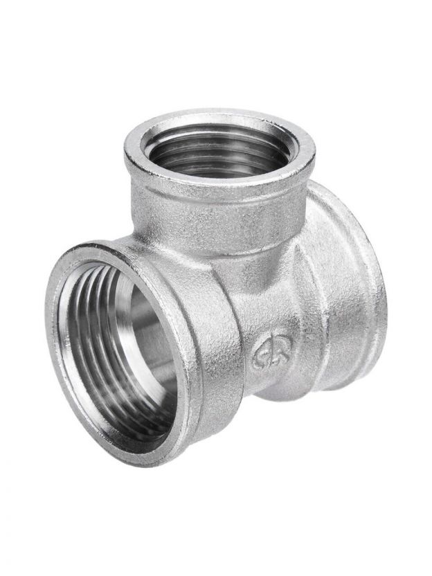 Тройник рассчитан на диаметры 1 дюйм и 3/4 дюйма с внутренней резьбой (г-г-г), что позволяет подключать трубы стандартных размеров для воды и газа.