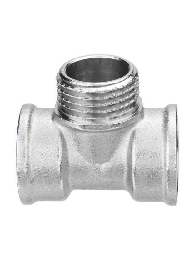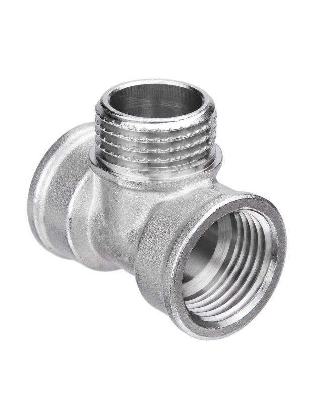 Обратите внимание на материал (латунь с никелированием — оптимален для воды и газа), тип резьбы (г-ш-г), размеры подключения (3/4" и 1/2"), чтобы тройник подходил к вашей системе.