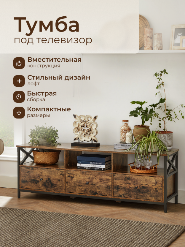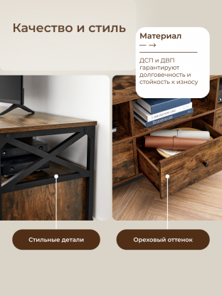 Эта тумба не только красива, но и практична. Она выдерживает нагрузку до 30 кг, что позволяет без опасений размещать на ней технику и аксессуары. Благодаря качественным материалам, таким как ДСП и ДВП, тумба отличается долговечностью и устойчивостью к износу. Стиль лофт, в котором выполнен этот предмет мебели, идеально подойдет для современных интерьеров, добавляя нотку индустриального шика и утонченности.