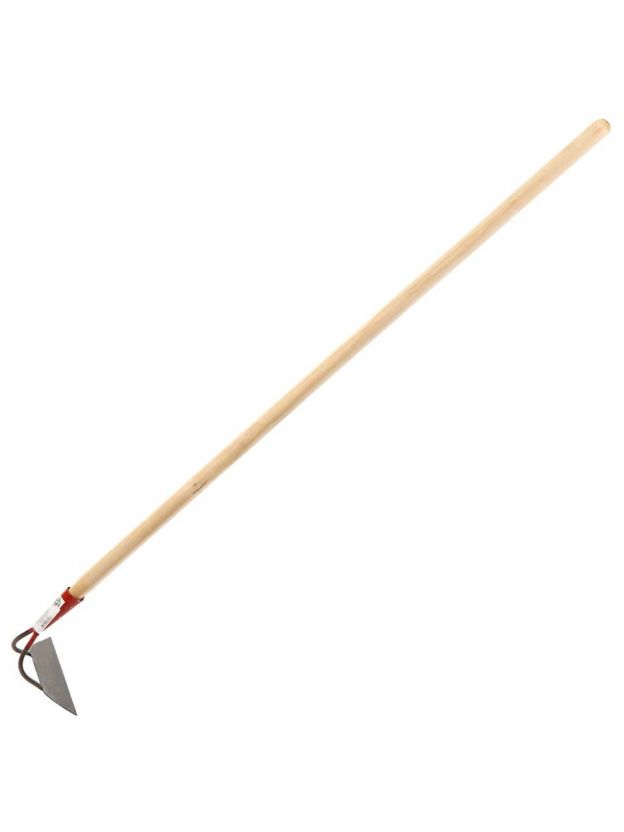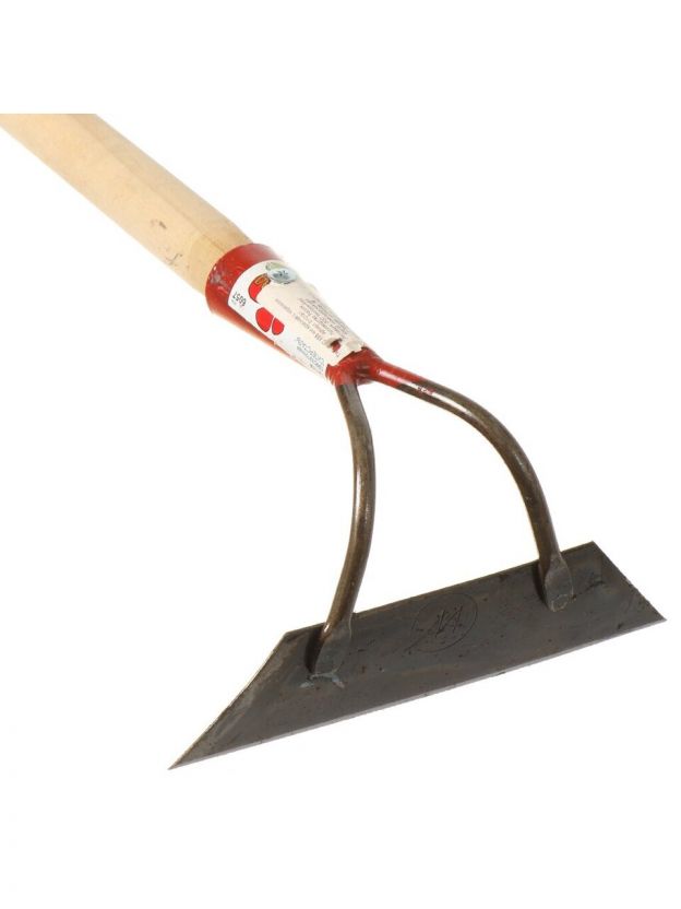 Металлическая тяпка изготовлена из высококачественной стали с термообработкой, имеет характерную особенность самозатачиваться в процессе работы. Режущая часть тяпки имеет твердый слой (закален на глубину 0,1 мм до твердости HRC 63 единицы) и мягкий слой, который стачивается во время работы, позволяя тяпке оставаться всегда острой. Ширина закалки 30 мм. Специальное клеймо, нанесённое на поверхность тяпки, подтверждает, что она является самозаточной. Твердость можно проверить напильником - он будет скользить. Подправить лезвие можно только абразивным бруском. Необходима для прополки, рыхления почвы, окучивания грядок.