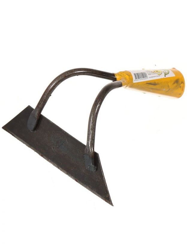 Металлическая тяпка изготовлена из высококачественной стали с термообработкой, имеет характерную особенность самозатачиваться в процессе работы. Режущая часть тяпки имеет твердый слой (закален на глубину 0,1 мм до твердости HRC 63 единицы) и мягкий слой, который стачивается во время работы, позволяя тяпке оставаться всегда острой. Специальное клеймо, нанесённое на поверхность тяпки, подтверждает, что она является самозаточной. Твердость можно проверить напильником - он будет скользить. Подправить лезвие можно только абразивным бруском. Необходима для прополки, рыхления почвы, окучивания грядок.