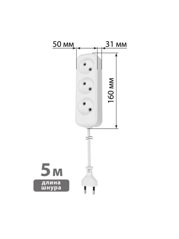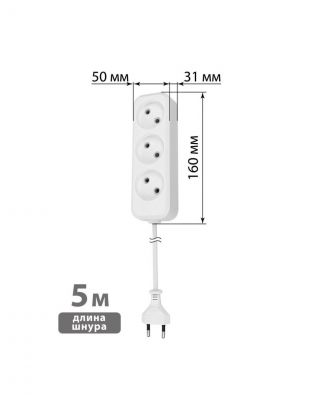Удлинитель 3 гнезда, 5 м, без заземления, 10 А, 2300 Вт, белый, TDM Electric, Народный УН3, SQ1303-1