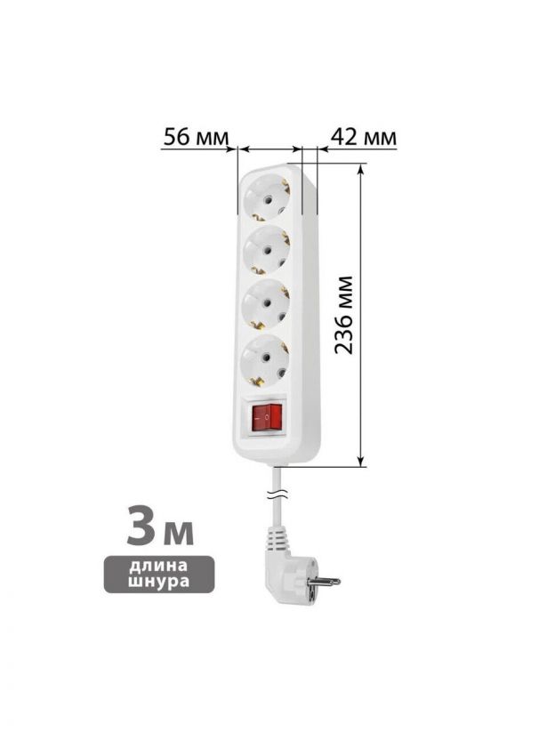 Удлинитель 4 гнезда, 3 м, с заземлением, 10 А, выключатель, 2300 Вт, белый, TDM Electric, Народный, SQ1303-11
