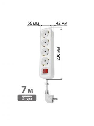 Удлинитель 4 гнезда, 7 м, с заземлением, 10 А, выключатель, 2300 Вт, белый, TDM Electric, Народный, SQ1303-11